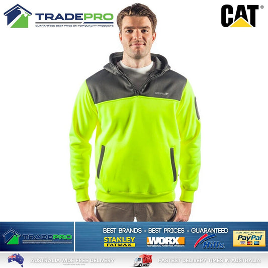 CAT Caterpillar Mens Genuine Hoodie Yellow Hi-Vis 1/4 Zip Jumper Workwear Small